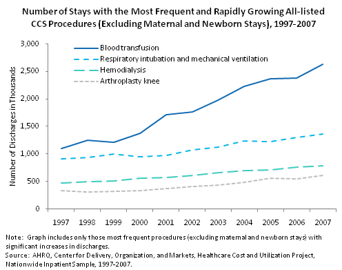- Discharges with blood transfusions more than doubled between 1997 and 2007. There were 1.1 million stays with this procedure in 1997 and 2.6 million in 2007, for a cumulative growth of 140 percent.