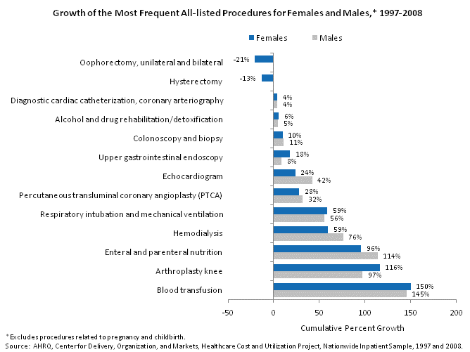 Growth of the most frequent all-listed procedures for females and males, 1997 through 2008. Bar chart. Cumulative percent growth. Oophorectomy, unilateral and bilateral: females: -21%. Hysterectomy: females: -13%. Diagnostic cardiac catheterization, coronary arteriography: females: 4%; males: 4%. Alcohol and drug rehabilitation/detoxification: females: 6%; males: 5%. Colonoscopy and biopsy: females: 10%; males: 11%. Upper gastrointestinal endoscopy: females: 18%; males: 8%. Echocardiogram: females: 24%; males: 42%. Percutaneous transluminal coronary angioplasty (PTCA): females: 28%; males: 32%. Respiratory intubation and mechanical ventilation: females: 59%; males: 56%. Hemodialysis: females: 59%; males: 76%. Enteral and parenteral nutrition: females: 96%; males: 114%. Arthroplasty knee: females: 116%; males: 97%. Blood transfusion: females: 150%; males: 145%. Note: Excludes procedures related to pregnancy and childbirth.