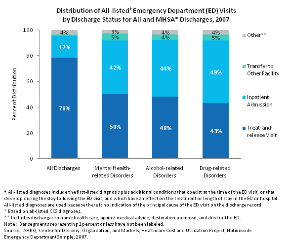 Distribution of all-listed emergency department (ED) visits by discharge status for all and MHSA discharges, 2007. Column chart. Percent distribution. All discharges: Other: 4%; transfer to other facility: 1%; inpatient admission: 17%; treat-and-release visit: 78%. Mental health-related disorders: Other: 3%; transfer to other facility: 5%; inpatient admission: 42%; treat-and-release visit: 50%. Alcohol-related disorders: Other: 4%; transfer to other facility: 4%; inpatient admission: 44%; treat-and-release visit: 48%. Drug-related disorders: Other: 4%; transfer to other facility: 5%; inpatient admission: 49%; treat-and-release visit: 43%. Note: All-listed diagnoses include the first-listed diagnosis plus additional conditions that coexist at the time of the ED visit, or that develop during the stay following the ED visit, and which have an effect on the treatment or length of stay in the ED or hospital. All-listed diagnoses are used because there is no indication of the principal cause of the ED visit on the discharge record. Note: MHSA discharges are based on all-listed CCS diagnoses. Note: Other includes discharges to home healthcare, against medical advice, destination unknown, and died in the ED.