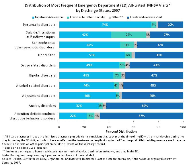 - Three-quarters of ED visits for personality disorders led to an inpatient admission in 2007 and another 4 percent in a transfer to another facility, such as a psychiatric hospital or to a skilled nursing or intermediate care facility. Only 20 percent of these visits resulted in treatment and release from the ED.