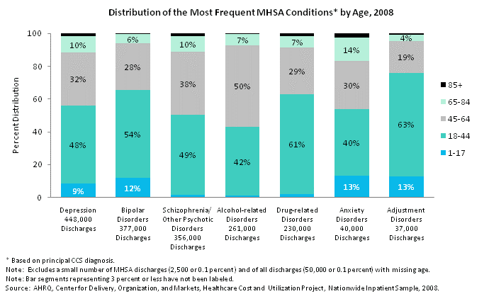 - For schizophrenia/other psychotic disorders, 18-44 year olds accounted for 49 percent of stays and 45-64 year olds accounted for 38 percent of stays.