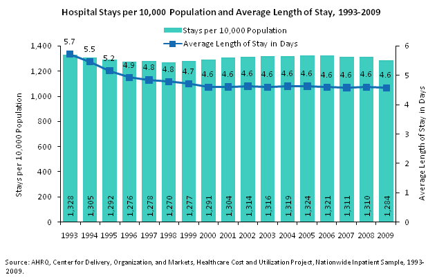 Hospital stays per 10,000 population and average length of stay, 1993 through 2009. Column chart and line chart. Stays per 10,000 population. 1993: 1,328; 1994: 1,305; 1995: 1,292; 1996: 1,276; 1997: 1,278; 1998: 1,270; 1999: 1,277; 2000: 1,291; 2001: 1,304; 2002: 1,314; 2003: 1,316; 2004: 1,319; 2005: 1,324; 2006: 1,321; 2007: 1,311; 2008: 1,310; 2009: 1,284. Average length of stay in days. 1993: 5.7; 1994: 5.5; 1995: 5.2; 1996: 4.9; 1997: 4.8; 1998: 4.8; 1999: 4.7; 2000: 4.6; 2001: 4.6; 2002: 4.6; 2003: 4.6; 2004: 4.6; 2005: 4.6; 2006: 4.6; 2007: 4.6; 2008: 4.6; 2009: 4.6. Source: AHRQ, Center for Delivery, Organization, and Markets, Healthcare Cost and Utilization Project, Nationwide Inpatient Sample, 1993-2009.