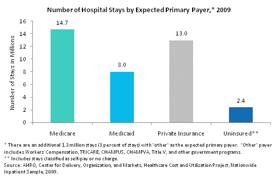 Number of hospital stays by expected primary payer, 2009. Column chart. Number of stays in millions. Medicare: 14.7; Medicaid: 8.0; private insurance: 13.0; uninsured: 2.4. Note: There are an additional 1.3 million stays (3% of stays) with "other" as the expected primary payer. "Other" payer includes Workers' Compensation, TRICARE, CHAMPUS, CHAMPVA, Title V, and other government programs. Note: Uninsured includes stays classified as self-pay or no charge. Source: AHRQ, Center for Delivery, Organization, and Markets, Healthcare Cost and Utilization Project, Nationwide Inpatient Sample, 2009.