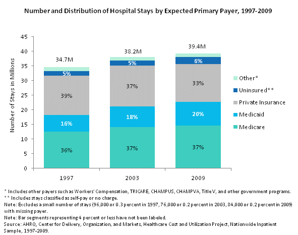 Number and distribution of hospital stays by expected primary payer, 1997 through 2009. Column chart. Number of stays in millions. 1997: 34.7; 2003: 38.2; 2009: 39.4. Distribution of stays. 1997: other: 4%; uninsured: 5%; private insurance: 39%; Medicaid: 16%; Medicare: 36%. 2003: other: 3%; uninsured: 5%; private insurance: 37%; Medicaid: 18%; Medicare: 37%. 2009: other: 3%; uninsured: 6%; private insurance: 33%; Medicaid: 20%; Medicare: 37%. Note: Other includes payers such as Workers' Compensation, TRICARE, CHAMPUS, CHAMPVA, Title V, and other government programs. Note: Uninsured includes stays classified as self-pay or no charge. Note: Excludes a small number of stays (96,000 or 0.3 percent in 1997, 76,000 or 0.2 percent in 2003, 84,000 or 0.2 percent in 2009) with missing payer. Source: AHRQ, Center for Delivery, Organization, and Markets, Healthcare Cost and Utilization Project, Nationwide Inpatient Sample, 1997-2009.