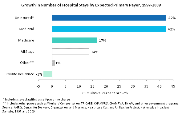 Uninsured: 42%; Medicaid: 42%; Medicare: 17%; all stays: 14%; other: 1%; private insurance: -3%. Note: Uninsured includes stays classified as self-pay or no charge. Note: Other includes payers such as Workers' Compensation, TRICARE, CHAMPUS, CHAMPVA, Title V, and other government programs. Source: AHRQ, Center for Delivery, Organization, and Markets, Healthcare Cost and Utilization Project, Nationwide Inpatient Sample, 1997 and 2009.