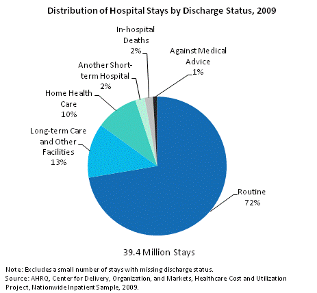 Distribution of hospital stays by discharge status, 2009. Pie chart. Routine: 72%; long-term care and other facilities: 13%; home healthcare: 10%; another short-term hospital: 2%; in-hospital deaths: 2%; against medical advice: 1%. 39.4 million total stays. Note: Excludes a small number of stays with missing discharge status. Source: AHRQ, Center for Delivery, Organization, and Markets, Healthcare Cost and Utilization Project, Nationwide Inpatient Sample, 2009.