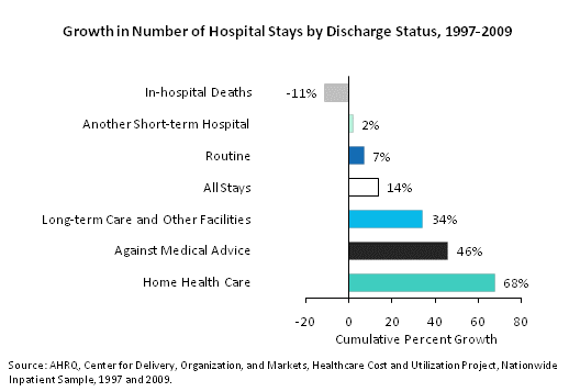 Growth in number of hospital stays by discharge status, 1997 through 2009. Bar chart. Cumulative percent growth. In-hospital deaths: -11%; another short-term hospital: 2%; routine: 7%; all stays: 14%; long-term care and other facilities: 34%; against medical advice: 46%; home healthcare: 68%. Source: AHRQ, Center for Delivery, Organization, and Markets, Healthcare Cost and Utilization Project, Nationwide Inpatient Sample, 1997 and 2009.
