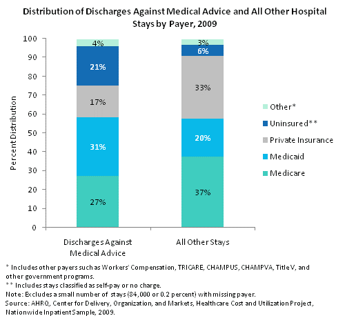 Distribution of discharges against medical advice and all other hospital stays by payer, 2009. Column chart. Percent distribution. Discharges against medical advice: other: 4%; uninsured: 21%; private insurance: 17%; Medicaid: 31%; Medicare: 27%. All other stays: other: 3%; uninsured: 6%; private insurance: 33%; Medicaid: 20%; Medicare: 37%. Note: Other includes payers such as Workers' Compensation, TRICARE, CHAMPUS, CHAMPVA, Title V, and other government programs. Note: Uninsured includes stays classified as self-pay or no charge. Note: Excludes a small number of stays (84,000 or 0.2%) with missing payer. Source: AHRQ, Center for Delivery, Organization, and Markets, Healthcare Cost and Utilization Project,