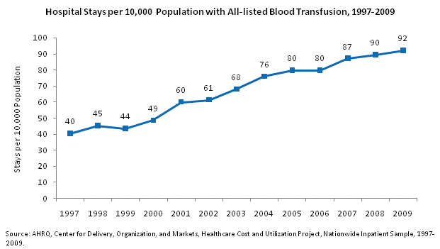 - The rate of stays with all-listed blood transfusion has increased at a relatively steady rate from 40 stays per 10,000 population in 1997 to 92 stays per 10,000 population in 2009.