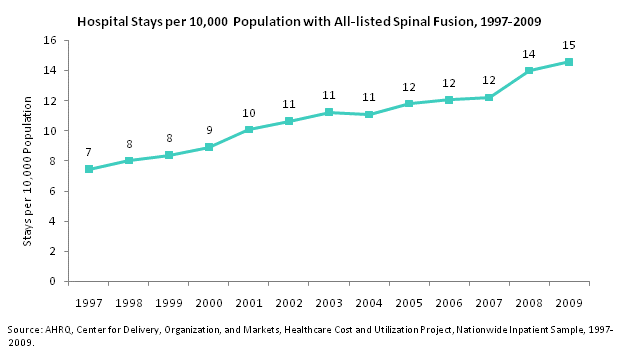 - The rate of hospitalizations with spinal fusion doubled from 7 stays per 10,000 population in 1997 to 15 stays per 10,000 population in 2009.