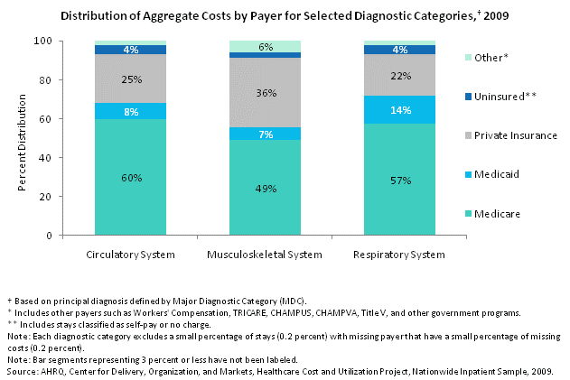 Distribution of aggregate costs by payer for selected diagnostic categories, 2009. Column chart. Percent distribution. Circulatory system. Other: 2%; uninsured: 4%; private insurance: 25%; Medicaid: 8%; Medicare: 60%. Musculoskeletal system. Other: 6%; uninsured: 3%; private insurance: 36%; Medicaid: 7%; Medicare: 49%. Respiratory system. Other: 3%; uninsured: 4%; private insurance: 22%; Medicaid: 14%; Medicare: 57%. Note: Diagnostic categories are based on principal diagnosis defined by Major Diagnostic Category (MDC). Note: Other includes other payers such as Workers' Compensation, TRICARE, CHAMPUS, CHAMPVA, Title V, and other government programs. Note: Uninsured includes stays classified as self-pay or no charge. Note: Each diagnostic category excludes a small percentage of stays (0.2%) with missing payer that have a small percentage of missing costs (0.2%). Source: AHRQ, Center for Delivery, Organization, and Markets, Healthcare Cost and Utilization Project, Nationwide Inpatient Sample, 2009.