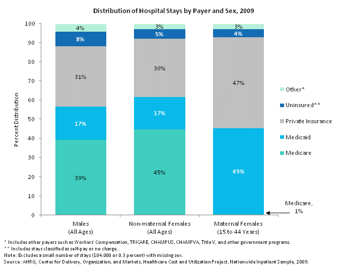 Distribution of hospital stays by payer and sex, 2009. Column chart. Percent distribution. Males (all ages). Other: 4%; uninsured: 8%; private insurance: 31%; Medicaid: 17%; Medicare: 39%. Non-maternal females (all ages). Other: 3%; uninsured: 5%; private insurance: 30%; Medicaid: 17%; Medicare: 45%. Maternal females (15 to 44 years). Other: 3%; uninsured: 4%; private insurance: 47%; Medicaid: 45%; Medicare: 1%. Note: Other includes other payers such as Workers' Compensation, TRICARE, CHAMPUS, CHAMPVA, Title V, and other government programs. Note: Uninsured includes stays classified as self-pay or no charge. Note: Excludes a small number of stays (104,000 or 0.3%) with missing sex. Source: AHRQ, Center for Delivery, Organization, and Markets, Healthcare Cost and Utilization Project, Nationwide Inpatient Sample, 2009.