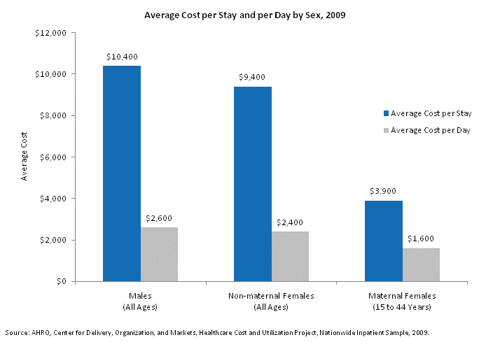 - The average cost per day of a hospital stay was about $200 less for non-maternal females than for males ($2,400 versus $2,600).