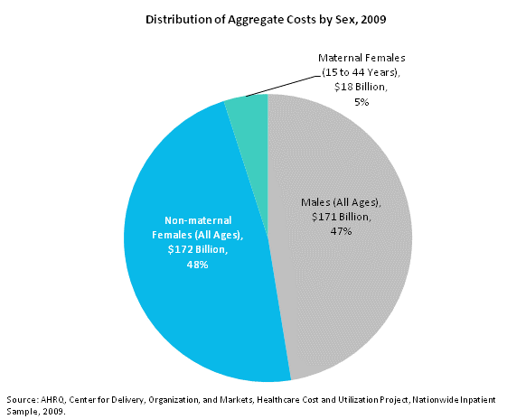 Distribution of aggregate costs by sex, 2009. Pie chart. Percent distribution. Males (all ages): $171 billion, 47%. Non-maternal females (all ages): $172 billion, 48%. Maternal females (15 to 44 years): $18 billion, 5%. Source: AHRQ, Center for Delivery, Organization, and Markets, Healthcare Cost and Utilization Project, Nationwide Inpatient Sample, 2009.