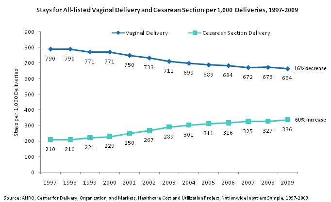 Stays for all-listed vaginal delivery and Cesarean section per 1,000 deliveries, 1997 through 2009. Line chart. Stays per 1,000 deliveries. Vaginal delivery. 16% decrease between 1997 and 2009. 1997: 790; 1998: 790; 1999: 771; 2000: 771; 2001: 750; 2002: 733; 2003: 711; 2004: 699; 2005: 689; 2006: 684; 2007: 672; 2008: 673; 2009: 664. Cesarean section delivery. 60% increase between 1997 and 2009. 1997: 210; 1998: 210; 1999: 221; 2000: 229; 2001: 250; 2002: 267; 2003: 289; 2004: 301; 2005: 311; 2006: 316; 2007: 325; 2008: 327; 2009: 336. Source: AHRQ, Center for Delivery, Organization, and Markets, Healthcare Cost and Utilization Project, Nationwide Inpatient Sample, 1997-2009.