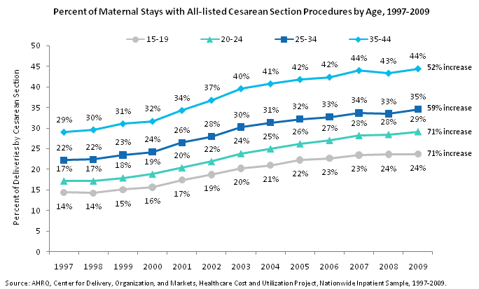 Percent of maternal stays with all-listed Cesarean section procedures by age, 1997 through 2009. Line chart. Percent of deliveries by Cesarean section. 15 to 19. 71% increase between 1997 and 2009. 1997: 14%; 1998: 14%; 1999: 15%; 2000: 16%; 2001: 17%; 2002: 19%; 2003: 20%; 2004: 21%; 2005: 22%; 2006: 23%; 2007: 23%; 2008: 24%; 2009: 24%. 20-24. 71% increase between 1997 and 2009. 1997: 17%; 1998: 17%; 1999: 18%; 2000: 19%; 2001: 20%; 2002: 22%; 2003: 24%; 2004: 25%; 2005: 26%; 2006: 27%; 2007: 28%; 2008: 28%; 2009: 29%. 25-34. 59% increase between 1997 and 2009. 1997: 22%; 1998: 22%; 1999: 23%; 2000: 24%; 2001: 26%; 2002: 28%; 2003: 30%; 2004: 31%; 2005: 32%; 2006: 33%; 2007: 34%; 2008: 33%; 2009: 35%. 35-44. 52% increase between 1997 and 2009. 1997: 29%; 1998: 30%; 1999: 31%; 2000: 32%; 2001: 34%; 2002: 37%; 2003: 40%; 2004: 41%; 2005: 42%; 2006: 42%; 2007: 44%; 2008: 43%; 2009: 44%. Source: AHRQ, Center for Delivery, Organization, and Markets, Healthcare Cost and Utilization Project, Nationwide Inpatient Sample, 1997-2009.