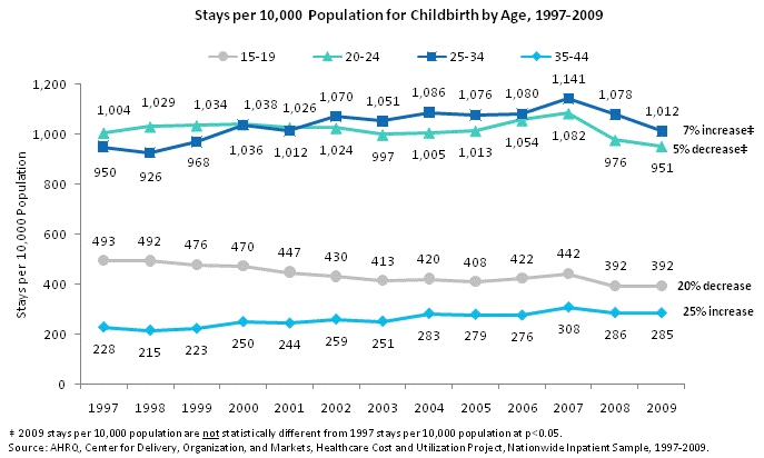 Stays per 10,000 population for childbirth by age, 1997 through 2009. Line chart. Stays per 10,000 population. 15 to 19. 20% decrease between 1997 and 2009. 1997: 493; 1998: 492; 1999: 476; 2000: 470; 2001: 447; 2002: 430; 2003: 413; 2004: 420; 2005: 408; 2006: 422; 2007: 442; 2008: 392; 2009: 392. 20-24. 5% decrease not statistically significant. 1997: 1,004; 1998: 1,029; 1999: 1,034; 2000: 1,038; 2001: 1,026; 2002: 1,024; 2003: 997; 2004: 1,005; 2005: 1,013; 2006: 1,054; 2007: 1,082; 2008: 976; 2009: 951. 25-34. 7% increase not statistically significant. 1997: 950; 1998: 926; 1999: 968; 2000: 1,036; 2001: 1,012; 2002: 1,070; 2003: 1,051; 2004: 1,086; 2005: 1,076; 2006: 1,080; 2007: 1,141; 2008: 1,078; 2009: 1,012. 35-44. 25% increase between 1997 and 2009. 1997: 228; 1998: 215; 1999: 223; 2000: 250; 2001: 244; 2002: 259; 2003: 251; 2004: 283; 2005: 279; 2006: 276; 2007: 308; 2008: 286; 2009: 285. Source: AHRQ, Center for Delivery, Organization, and Markets, Healthcare Cost and Utilization Project, Nationwide Inpatient Sample, 1997-2009.