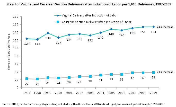 Stays for vaginal and Cesarean section deliveries after induction of labor per 1,000 deliveries, 1997 through 2009. Line chart. Stays per 1,000 deliveries. Vaginal delivery after induction of labor. 24% increase between 1997 and 2009. 1997: 124; 1998: 123; 1999: 138; 2000: 127; 2001: 134; 2002: 136; 2003: 132; 2004: 140; 2005: 148; 2006: 145; 2007: 151; 2008: 154; 2009: 154. Cesarean section delivery after induction of labor. 73% increase between 1997 and 2009. 1997: 22; 1998: 21; 1999: 24; 2000: 24; 2001: 26; 2002: 27; 2003: 28; 2004: 31; 2005: 33; 2006: 33; 2007: 37; 2008: 37; 2009: 38. Source: AHRQ, Center for Delivery, Organization, and Markets, Healthcare Cost and Utilization Project, Nationwide Inpatient Sample, 1997-2009.