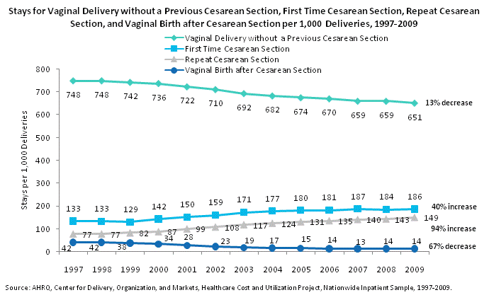 Stays for vaginal delivery without a previous Cesarean section, first time Cesarean section, repeat Cesarean section, and vaginal birth after Cesarean section per 1,000 deliveries, 1997 through 2009. Line chart. Stays per 1,000 deliveries. Vaginal delivery without a previous Cesarean section. 13% decrease between 1997 and 2009. 1997: 748; 1998: 748; 1999: 742; 2000: 736; 2001: 722; 2002: 710; 2003: 692; 2004: 682; 2005: 674; 2006: 670; 2007: 659; 2008: 659; 2009: 651. First time Cesarean section. 40% increase between 1997 and 2009. 1997: 133; 1998: 133; 1999: 129; 2000: 142; 2001: 150; 2002: 159; 2003: 171; 2004: 177; 2005: 180; 2006: 181; 2007: 187; 2008: 184; 2009: 186. Repeat Cesarean section. 94% increase between 1997 and 2009. 1997: 77; 1998: 77; 1999: 82; 2000: 87; 2001: 99; 2002: 108; 2003: 117; 2004: 124; 2005: 131; 2006: 135; 2007: 140; 2008: 143; 2009: 149. Vaginal birth after Cesarean section. 67% decrease between 1997 and 2009. 1997: 42; 1998: 42; 1999: 38; 2000: 34; 2001: 28; 2002: 23; 2003: 19; 2004: 17; 2005: 15; 2006: 14; 2007: 13; 2008: 14; 2009: 14. Source: AHRQ, Center for Delivery, Organization, and Markets, Healthcare Cost and Utilization Project, Nationwide Inpatient Sample, 1997-2009.