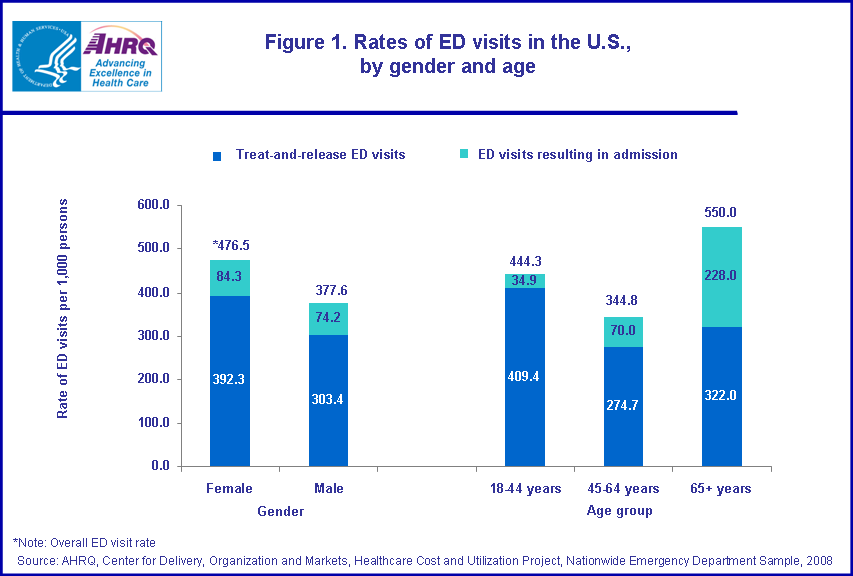 Figure 1. Rates of ED visits in the U.S., by patient demographics, 2008. Rate of ED visits per 1,000 persons, sex, female, Treat-and-release ED visits, 392.3; ED visits resulting in admission, 84.3; Total ED visits, 476.5*. Rate of ED visits per 1,000 persons, sex, male, Treat-and-release ED visits, 303.4; ED visits resulting in admission, 74.2; Total ED visits, 377.6. Rate of ED visits per 1,000 persons, age group, 18 through 44 years, Treat-and-release ED visits, 409.4; ED visits resulting in admission, 34.9; Total ED visits, 444.3.