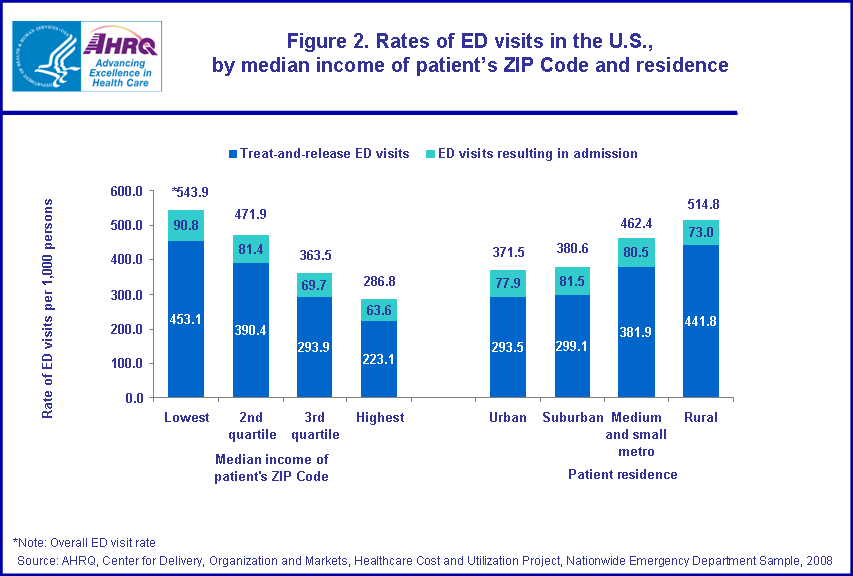 Figure 2. Rates of ED visits in the U.S., by patient demographics, 2008. Rate of ED visits per 1,000 persons, Median income of patient’s ZIP Code, Lowest, Treat-and-release ED visits, 453.1; ED visits resulting in admission, 90.8; Total ED visits, 543.9*. Rate of ED visits per 1,000 persons, Median income of patient’s ZIP Code, 2nd quartile, Treat-and-release ED visits, 390.4; ED visits resulting in admission, 81.4; Total ED visits, 471.9. Rate of ED visits per 1,000 persons, Median income of patient’s ZIP Code, 3rd quartile, Treat-and-release ED visits, 293.9; ED visits resulting in admission, 69.7; Total ED visits, 363.5. Rate of ED visits per 1,000 persons, Median income of patient’s ZIP Code, Highest, Treat-and-release ED visits, 223.1; ED visits resulting in admission, 63.6; Total ED visits, 286.8. Rate of ED visits per 1,000 persons, Patient residence; Urban, Treat-and-release ED visits, 293.5; ED visits resulting in admission, 77.9; Total ED visits, 371.5. Rate of ED visits per 1,000 persons, Patient residence; Suburban, Treat-and-release ED visits, 299.1; ED visits resulting in admission, 81.5; Total ED visits, 380.6. Rate of ED visits per 1,000 persons, Patient residence; Medium and small metro, Treat-and-release ED visits, 381.9; ED visits resulting in admission, 80.5; Total ED visits, 462.4. Rate of ED visits per 1,000 persons, Patient residence; Rural, Treat-and-release ED visits, 441.8; ED visits resulting in admission, 73.0; Total ED visits, 514.8. *Note: Overall ED visit rate. Source: AHRQ, Center for Delivery, Organization and Markets, Healthcare Cost and Utilization Project, Nationwide Emergency Department Sample, 2008.