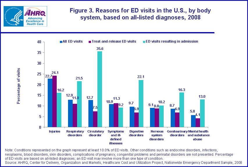 Figure 3. Reasons for ED visits in the U.S., by body system, based on all-listed diagnoses, 2008. Percentage of visits, Injuries; All ED visits, 22.7.; Treat-and-release ED visits, 24.1; ED visits resulting in admission, 16.2; Percentage of visits, Respiratory disorders; All ED visits, 12.9.; Treat-and-release ED visits, 11.0; ED visits resulting in admission, 21.5; Percentage of visits, Circulatory disorder; All ED visits, 12.7.; Treat-and-release ED visits, 7.5; ED visits resulting in admission, 35.6; Percentage of visits, Symptoms and ill-defined illnesses; All ED visits, 10.9.; Treat-and-release ED visits, 11.3; ED visits resulting in admission, 9.2; Percentage of visits, Digestive disorders; All ED visits, 9.7.; Treat-and-release ED visits, 6.9; ED visits resulting in admission, 22.1; Percentage of visits, nervous system disorders; All ED visits, 9.1.; Treat-and-release ED visits, 8.8; ED visits resulting in admission, 10.2; Percentage of visits, genitourinary disorders; All ED visits, 8.7.; Treat-and-release ED visits, 6.9; ED visits resulting in admission, 16.3; Percentage of visits, mental health and substance abuse; All ED visits, 5.8.; Treat-and-release ED visits, 4.1; ED visits resulting in admission, 13.0. NOTE: Conditions represented on the graph represent at least 10.0% of one type of ED visit. Other conditions such as endocrinedisorders, infections, neoplasms, blood disorders, skin disorders, complications of pregnancy, congenital problems and perinataldisorders are not presented. Percentage of ED visits are based on all-listed diagnoses; an ED visit may involve more than one type of condition. Source: AHRQ, Center for Delivery, Organization and Markets, Healthcare Cost and Utilization Project, Nationwide Emergency Department Sample, 2008.