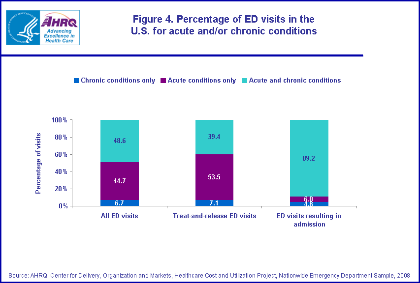 Figure 4. Percentage of ED visits in the U.S. for acute and/or chronic conditions. Percentage of ED visits, all ED visits; Chronic conditions, 6.7; acute conditions only, 44.7.; acute and chronic conditions, 48.6; Percentage of ED visits, treat and release ED visits; Chronic conditions, 7.1; acute conditions only, 53.5.; acute and chronic conditions, 39.4; Percentage of ED visits, all ED visits; Chronic conditions, 4.8; acute conditions only, 6.0.; acute and chronic conditions, 89.2; Source: AHRQ, Center for Delivery, Organization and Markets, Healthcare Cost and Utilization Project, Nationwide Emergency Department Sample, 2008.