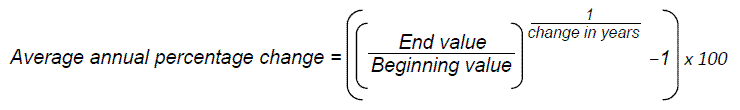Average annual percentage change equals open parenthesis, open parenthesis, end value divided by beginning value, close parenthesis, to the power of 1 divided by change in years, minus 1, close parenthesis, multiplied by 100.