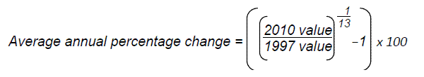 Average annual percentage change equals open parenthesis, open parenthesis, 2010 value divided by 1997 value, close parenthesis, to the power of 1 divided by 13, minus 1, close parenthesis, multiplied by 100.