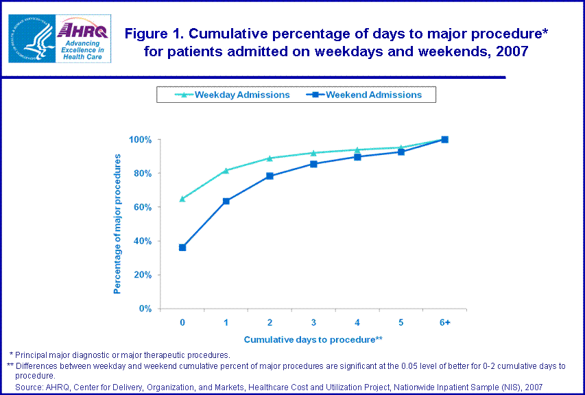 Most patients entering the hospital on weekends usually do so because of a medical emergency. Patients admitted on weekends tend to experience delays in receiving major procedures (figure 1). On the day of admission, weekend-admitted patients received 36 percent of major procedures that they would be receiving during their stays, compared to 65 percent for patients admitted on weekdays. The treatment gap for major procedures did not become insignificant until day three after admission. Although the delay in treatment may be related to the scheduled nature of weekday procedures, it may also be an indicator of quality of care. Table 2 lists selected conditions that are likely to require immediate treatment and the associated major procedure performed for each. Conditions are grouped by the delay in treatment, beginning with conditions for which there was no significant delay in treatment or the weekend admissions were treated sooner than weekday admissions. Subsequent entries list conditions with a statistically significant delay in treatment for the day of admission and then for days one and two after admission. For certain conditions requiring immediate treatment, the days between admission and the major procedure occurred with the same or shorter wait times for weekend as weekday admissions. For example, by the first day after a weekend and a weekday admission, 98 percent of appendectomies had been completed, as had 98 percent of artificial rupture of membranes to assist delivery and 71–73 percent of procedures to treat a fracture or dislocation of hip and femur. Patients requiring wound debridement to treat open wounds or burns received treatment more quickly on weekends (53 percent on the day of admission) than on weekdays (47 percent), as did patients admitted for aortic resection, replacement or anastomosis to treat dissecting or ruptured aneurysm (79 percent received treatment on the day of a weekend admission compared to 72 percent for weekday admissions). For some conditions, there were gaps in the percentage of procedures performed for weekend admissions on the day of admission but this difference disappeared by the first day after admission. For example, for removal of a clot from the arteries of the legs, 57 percent of weekend admissions and 65 percent of weekday admissions received treatment on the day of admission. Exploratory abdominal surgery was performed on the day of admission for only 54 percent of weekend admissions compared to 60 percent of weekday admissions. For several other conditions, patients admitted on weekends experienced even longer treatment delays. For heart attacks treated or diagnosed using various cardiac procedures (coronary artery bypass graph (CABG), PTCA, dissolving of blood clot in the heart, and diagnostic procedure to explore the functioning of the heart), a lower share of procedures was performed by the first day after a weekend admission (64 percent) than first day after a weekday admission (76 percent). Non-hip fractures also experienced some delay in surgical repair for patients admitted on weekends, as measured at the first day after admission: 76 percent of weekend admissions for non-hip fractures received treatment compared to 80 percent of weekday admissions. The treatment gap did not disappear until day two after admission for both of these conditions. For two other conditions (hip replacement to treat a hip fracture and gastrointestinal (GI) endoscopy to treat a GI bleed), there was no difference in time to treatment between weekend and weekday admissions; for both groups 13–16 percent of GI bleed cases received endoscopy. However, weekend admissions experienced longer wait times on the first day after admission, a gap that disappeared by day two after admission. The treatment delays for patients admitted on weekends versus weekdays were significant for angina, gall bladder removal to treat acute cholecystitis, and hernia repair to treat complicated hernia from the day of admission; these delays did not abate until more than two days after admission. For comparison, table 2 also shows procedures where delay in immediate treatment was usually not critical. Wait times for these procedures following weekend admissions were significantly longer than for weekday admissions. Only 50–76 percent of patients admitted on the weekend and who underwent procedures for back surgery, thyroidectomy, or arthroplasty of the knee had the procedure by the first day after admission, compared to 93–98 percent of patients admitted on a weekday. Reasons for weekend admissions Table 3 displays the number of discharges for specific conditions. The most common reason for admission to the hospital during the weekend in 2007 was for the birth of a newborn infant (923,000 discharges), followed by pneumonia (286,000 discharges). Four of the top 10 conditions were cardiac-related and included congestive heart failure (227,000 discharges), chest pain (191,000 discharges), heart attack (161,000 discharges), and irregular heart beat (cardiac dysrhythmias) (142,000 discharges). Blood infection (septicemia), chest pain, mood disorders, and COPD were common conditions among patients admitted on weekends. Table 3 also examines the 10 most frequently occurring reasons for hospitalization among the top 100 conditions. Some of these reasons for admission were more likely to occur on the weekend, such as certain injuries. Thirty-four percent of all admissions for crushing or internal injuries and 32 percent of admissions for brain injuries prompted weekend admissions in 2007. However, some of the top reasons were no more likely (and some were less likely) to occur for admissions that began on weekends than on weekdays. These admissions included other accident-related reasons—such as fractures of the upper and lower limbs and hip—and other reasons, such as poisonings by other medications and drugs, fainting, aspiration of stomach contents into the lungs, heart attack