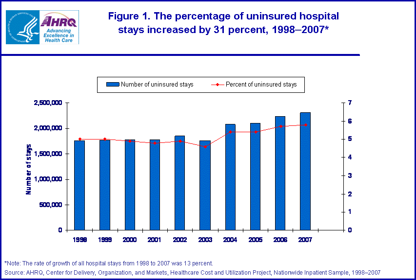 Introduction From 1998 to 2007, the number of uninsured individuals in the United States increased by about 11 million people, to more than 53 million.1 Trends in health insurance coverage can be driven by several factors including changes in employer-sponsored health benefits, the incomes of working families, the costs of health insurance premiums, and the accessibility of public insurance programs.2 Lack of health insurance impacts the low-income population disproportionately, with four in ten low-income Americans being uninsured.3 When there is no insurance coverage, hospitals bill patients directly. The resulting burden of payment for uninsured individuals and their families can be substantial, particularly during an economic downturn. Likewise, when these bills remain unpaid, the costs of uncompensated care represent a financial burden to hospitals and, ultimately, contribute to increases in healthcare costs to society overall. This Statistical Brief presents data from the Healthcare Cost and Utilization Project (HCUP) on a 10-year trend in uninsured hospital stays from 1998 to 2007. Characteristics of uninsured hospitalizations, such as changes in utilization, cost, patient populations, and geographic locations, are compared to the overall picture of hospital care. All differences between estimates noted in the text are statistically significant at the 0.05 level or better. Findings General findings The number of uninsured hospitalizations in America grew steadily from 1998 to 2007 (table 1). In 1998, there were 1.8 million uninsured stays compared to more than 2.3 million uninsured stays in 2007—a 31 percent increase in 10 years (figure 1). During the same time period, hospitalizations billed to Medicaid (the public insurance program for low-income individuals) increased by 33 percent, stays billed to Medicare (the public insurance program for the elderly and disabled) increased by 13 percent, and the number of privately insured stays remained relatively stable (figure 2). The overall growth in all hospital stays was about 13 percent. |