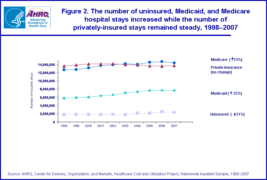 Figure 2. The number of uninsured, Medicaid, and Medicare hospital stays increased while the number of privately-insured stays remained steady, 1998–2007. 1998, Medicare, 12,690,595; Medicaid, 5,767,727; Private Insurance, 13,637,181; Uninsured, 1,759,789.