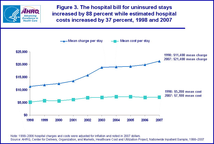 Figure 3. The hospital bill for uninsured stays increased by 88 percent while estimated hospital costs increased by 37 percent, 1998 and 2007.