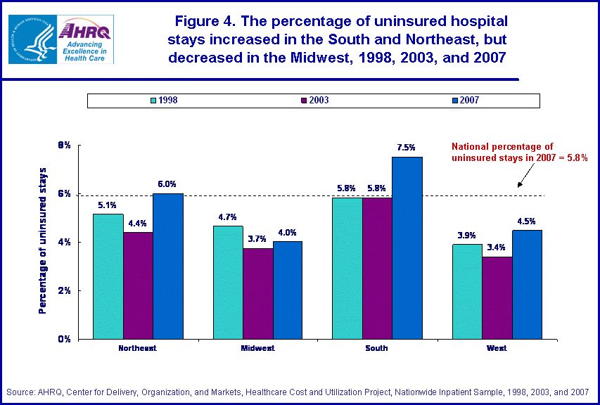 Hospital charges reflect the amount the hospital billed for the hospital stay. While these charges generally are discounted for insured patients, the uninsured population typically has been billed the full amount. From 1998 to 2007, hospital charges for the uninsured increased substantially with an 88 percent growth in average charges, from $11,400 to $21,400 per stay (after accounting for inflation) (table 1 and figure 3). Total charges for the uninsured in 2007 were about $50 billion. Meanwhile, the estimated hospital costs of providing care (i.e., the amount the hospital incurred to provide services) also increased for uninsured stays, but at a slower rate of about 37 percent, from $5,200 to $7,100 per stay. Total costs for the uninsured in 2007 were $16.5 billion. The increases in hospital charges and costs can not be attributed to patients staying at the hospital longer because the mean length of uninsured stays over the 10-year period remained consistent at about 4 days. Comparison of uninsured stays to hospital stays overall, 2007 Table 2 provides more detailed information about uninsured hospital stays in 2007 relative to all hospital stays. Comprising almost 6 percent of all hospital stays, uninsured hospitalizations were, on average, shorter and less expensive. Aggregate hospital costs to render uninsured hospital care totaled more than $16.5 billion in 2007—about 5 percent of hospital costs overall. The mean cost of an uninsured hospital stay was about $1,600 less expensive ($7,100 versus $8,700 per hospital stay) and shorter (4.0 versus 4.6 days) than a typical hospital stay. Uninsured patients were nearly 4 times more likely to leave against medical advice. They were 3.5 times less likely to be discharged to home healthcare, and slightly less likely to die in the hospital. Uninsured hospital stays, by patient characteristics, 2007 Among uninsured hospitalizations, stays were about equally divided between men (51.4 percent) and women (48.1 percent); whereas, women accounted for a larger percentage of all hospital stays (58.7 percent) (table 3). The mean age of uninsured patients was about 12 years younger than for the overall patient population (35 years versus 47 years, respectively). Individuals ages 18 to 44 years comprised about 38 percent of the total U.S. population, but accounted for nearly half of all uninsured stays (table 3). Uninsured elderly care was rare given the availability of Medicare insurance coverage for the elderly. When elderly hospital stays were excluded, the mean age for uninsured patients was comparable to non-elderly patients overall (35 years compared to 32 years, respectively). Excluding elderly stays also resulted in larger differences between the percentage of uninsured versus insured hospital stays for children (ages less than 1 and 1–17 years) and smaller differences among non-elderly adults (ages 18–44 and 45–64 years). In 2007, uninsured hospitalization rates were 1.8 times higher among populations living in the poorest areas compared to those living in other communities (10.9 versus 5.9 uninsured stays per 1,000 population, respectively). Among hospital stays overall, the rate of hospital stays in the poorest areas was 1.2 times greater than in communities. Most common principal diagnoses associated with uninsured hospitalizations, 2007 Table 4 shows that from 1998 to 2007 newborn birth remained the most common reason for uninsured hospitalizations, accounting for more than 252,000 uninsured stays in 2007 (10.9 percent of all uninsured stays). Newborn birth was also the most frequent reason for admission among all hospital stays (11.5 percent of all stays). The number of hospital stays for skin infections, a potentially preventable event given early intervention, showed a significant change in the uninsured population between 1998 and 2007. Uninsured hospitalizations for skin infections increased sharply from about 31,000 stays in 1998 to 73,300 stays in 2007, representing nearly twice the portion of uninsured stays in 2007 (3.2 percent in 2007 compared to 1.8 percent in 1998). In 2007, skin infections were reported more than twice as frequently in uninsured stays compared to all stays. Mental health and substance abuse conditions (mood-, alcohol-, and substance-related disorders) remained a common reason for uninsured hospital stays, collectively accounting for 213,300 stays in 2007 (9.3 percent of all uninsured stays). These conditions were more frequently cited as the main reason for hospitalization in uninsured stays compared to all hospital stays. In fact, in 2007, stays principally for alcohol and substance abuse were about 4 times more common in uninsured stays compared to all hospitalizations and stays for mood disorders were twice as common in uninsured stays. Two of the other most common reasons for uninsured hospital stays included cardiac conditions, nonspecific chest pain and hardening of the arteries, collectively accounting for 116,100 uninsured stays (5.0 percent of all uninsured stays). While stays for nonspecific chest pain were slightly more common among uninsured hospitalizations compared to overall hospital stays, hospitalizations for hardening of the arteries were less common in uninsured stays. Stays for pneumonia and diabetes with complications were also commonly cited in uninsured hospital stays. Uninsured stays for pneumonia decreased slightly from 1998 to 2007 and were less common than in overall hospital stays. The percentage of uninsured stays for diabetes with complications remained more common among uninsured stays representing about 2 percent of all uninsured stays over the 10-year period. Uninsured hospital stays, by region, 1998–2007 From 1998 to 2007, uninsured hospitalization rates increased in every region except the Midwest (figure 4). The proportion of uninsured hospitalizations grew by 29.2 percent in the South, 17.2 percent in the Northeast, and 14.3 percent in the West; meanwhile, the perc
