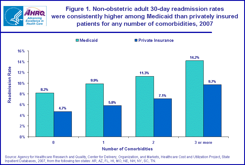 • 30-day readmission rates increased with the number of comorbidities. The non-obstetric adult readmission rates were consistently higher for Medicaid than for privately insured patients with the same number of comorbidities (1.5 to 1.7 times higher).