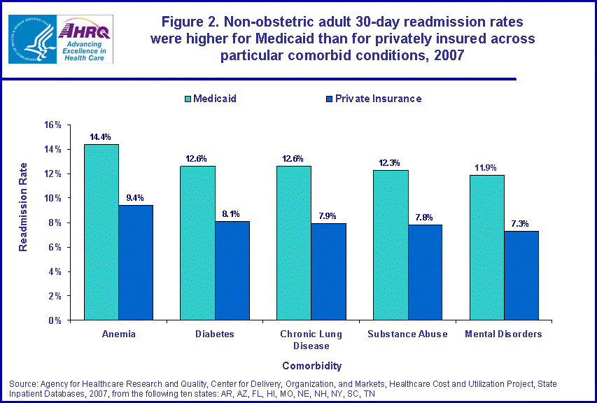 • Medicaid patients had higher readmission rates than privately insured patients. For instance, the non-obstetric 30-day readmission rate was 10.7 percent for Medicaid adults compared with 6.3 percent for the privately insured.
