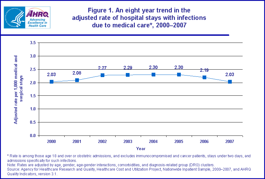 Figure 1. An eight year trend in the adjusted rate of hospital stays with infections due to medical care*, 2000–2007. Adjusted rate per 1,000 medical and surgical stays in 2000, 2.03; in the year 2001, 2.08; in 2002, 2.27; in 2003, 2.29; in 2004, 2.30; in 2005, 2.30; in 2006, 2.19; in 2007, 2.03. * Rate is among those age 18 and over or obstetric admissions, and excludes immunocompromised and cancer patients, stays under two days, and admissions specifically for such infections. Note: Rates are adjusted by age, sex, age-sex interactions, comorbidities, and diagnosis-related group (DRG) clusters. Source: Agency for Healthcare Research and Quality, Healthcare Cost and Utilization Project, Nationwide Inpatient Sample, 2000–2007, and AHRQ Quality Indicators, version 3.1.