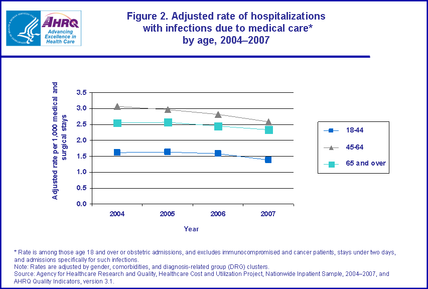 Figure 2. Adjusted rate of hospitalizations with infections due to medical care* by age, 2004–2007. Adjusted rate per 1,000 medical and surgical stays; ages 18 through 44; in the year 2004, 1.62; in 2005, 1.63; in 2006, 1.58; in 2007, 1.38. Adjusted rate per 1,000 medical and surgical stays; ages 45 through 64; in the year 2004, 3.06; in 2005, 2.96; in 2006, 2.82; in 2007, 2.58. Adjusted rate per 1,000 medical and surgical stays; age 65 and over; in the year 2004, 2.55; in 2005, 2.56; in 2006, 2.45; in 2007, 2.33. * Rate is among those age 18 and over or obstetric admissions, and excludes immunocompromised and cancer patients, stays under two days, and admissions specifically for such infections. Note: Rates are adjusted by sex, comorbidities, and diagnosis-related group (DRG) clusters. Source: Agency for Healthcare Research and Quality, Healthcare Cost and Utilization Project, Nationwide Inpatient Sample, 2004–2007, and AHRQ Quality Indicators, version 3.1.