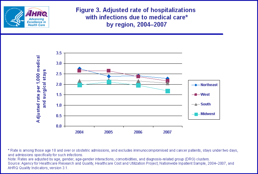 Patient and stay characteristics Among hospitals stays with infections due to medical care, slightly more than half (53.5%) were paid for by Medicare (table 1). The second largest expected payer, with 23.7 percent of stays, was private insurance, followed by Medicaid with 14.9 percent. The remaining 4.4 percent and 3.6 percent were uninsured and other payers, respectively. This payer distribution varies from all other discharges, where a smaller percentage, only 41.4, had Medicare as expected payer and a greater percentage, 32.1, had private insurance. For infection stays, 54.4 percent were admitted through the emergency department, while 10.7 percent came from another hospital and 3.0 percent came from another health facility, including long term care (LTC) facilities. The average length of stay with an infection due to medical care was 24.4 days and resulted in a cost of $52,096. This is more than 19 days longer and nearly $43,000 more expensive than the average stay for all other discharges. Patients with infections due to medical care also had, on average, a greater number of comorbidities (2.8 vs. 1.9) and greater in-hospital mortality (9.0 vs. 1.5 percent) compared to all other discharges. Hospital characteristics The greatest proportion of stays with infections due to medical care were in hospitals with 100 to 299 beds (35.0 percent) and 300 to 499 beds (32.8 percent). When compared to all other stays, infection stays were more likely to be at very large hospitals of 500 beds or greater, and less likely to be at smaller hospitals that had fewer than 300 beds. Slightly more than 93 percent of stays with infections occurred at metropolitan hospitals, which was about 7 percentage points greater than all other stays. A majority of infection stays, 68.6 percent, were at private, not for profit hospitals, which is a smaller percentage than all other stays, with 72.1 percent of stays for that hospital type. Stays with infections were more likely to occur at private, for profit and teaching hospitals than all other stays. Most common principal diagnoses Among stays with infections due to medical care, the top three principal diagnoses were septicemia; adult respiratory failure, insufficiency or arrest; and complications of surgical procedures or medical care (table 2). These diagnoses were present in 11.8, 5.9, and 4.1 percent of infection stays, compared to only 2.0, 1.2, and 1.3 percent of all other stays. Pneumonia and congestive heart failure were also common among stays with infection due to medical care at 3.0 and 2.8 percent, but they were found at similar rates (3.4 and 3.4 percent) among all other stays. Trends in rates During the eight year period from 2000 to 2007, the adjusted rate of infections due to medical care per 1,000 medical and surgical hospital stays began at 2.03, peaked at 2.30 in 2004 and 2005, and declined again to 2.03 in 2007 (figure 1). All age groups followed the same downward trend during this four year period (figure 2). The rate was highest in the 45 to 64 year group and lowest in the 18 to 44 year group. The 45 to 64 year old group also had the greatest reduction in rate of infections, at 0.48 per 1,000 or 15.7 percent. Rates decreased for all four regions, ranging from a 4.7 percent reduction in the South to an 18.0 percent reduction in the West (figure 3). The Midwest had the lowest rate for all four years and had a reduction of 14.1 percent. The uninsured had the lowest rate of infections due to medical care each year and had the greatest percentage reduction (24.7) (figure 4). On the other end of the spectrum, patients covered by Medicaid had the highest rate each year. While all payers saw reductions in the adjusted rate of infection from 2004 to 2007, patients with Medicaid had the lowest percentage in reduction, at 8.7 percent Data Source The estimates in this Statistical Brief are based upon data from the HCUP 2007 Nationwide Inpatient Sample (NIS). Historical data were drawn from the 2000, 2004, 2005, and 2006 NIS and analyzed using the Agency for Healthcare Research and Quality’s Quality Indicator Software. Definitions Diagnoses, ICD-9-CM, and Clinical Classifications Software (CCS) The principal diagnosis is that condition established after study to be chiefly responsible for the patient’s admission to the hospital. Secondary diagnoses are concomitant conditions that coexist at the time of admission or that develop during the stay. ICD-9-CM is the International Classification of Diseases, Ninth Revision, Clinical Modification, which assigns numeric codes to diagnoses. There are about 13,600 ICD-9-CM diagnosis codes. CCS categorizes ICD-9-CM diagnoses into a manageable number of clinically meaningful categories. 7 This "clinical grouper" makes it easier to quickly understand patterns of diagnoses and procedures. Case Definition Infections due to medical care cases were identified using the criteria set forth by AHRQ for Patient Safety Indicator (PSI) #7 (version 3.1). This indicator is intended to flag cases of infection due to medical care, primarily those associated with the placement of vascular devices or grafts, as well as those related to infusions, injections, transfusions, or vaccinations. The ICD-9-CM codes defining selected infections due to medical care are: