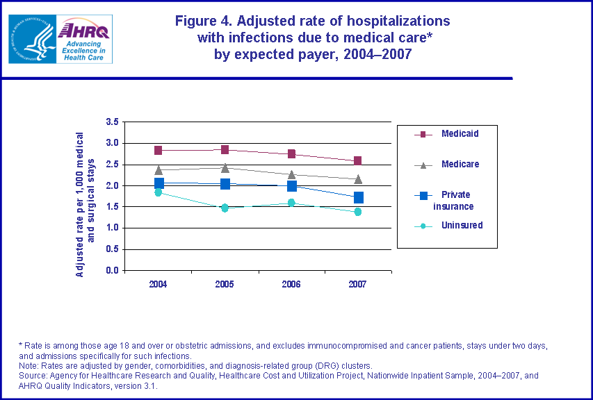 Figure 4. Adjusted rate of hospitalizations with infections due to medical care* by expected payer, 2004–2007. Adjusted rate per 1,000 medical and surgical stays; Medicaid, in the year 2004, 2.82; in 2005, 2.84; in 2006, 2.74; in 2007, 2.58. Adjusted rate per 1,000 medical and surgical stays; Medicare, in the year 2004, 2.37; in 2005, 2.42; in 2006, 2.27; in 2007, 2.16. Adjusted rate per 1,000 medical and surgical stays; Private insurance; in the year 2004, 2.06; in 2005, 2.06; in 2006, 1.99; in 2007, 1.74. Adjusted rate per 1,000 medical and surgical stays; Uninsured; in the year 2004, 1.84; in 2005, 1.46; in 2006, 1.60; in 2007, 1.39. Rate is among those age 18 and over or obstetric admissions, and excludes immunocompromised and cancer patients, stays under two days, and admissions specifically for such infections. Note: Rates are adjusted by sex, comorbidities, and diagnosis-related group (DRG) clusters. Source: Agency for Healthcare Research and Quality, Healthcare Cost and Utilization Project, Nationwide Inpatient Sample, 2004–2007, and AHRQ Quality Indicators, version 3.1.