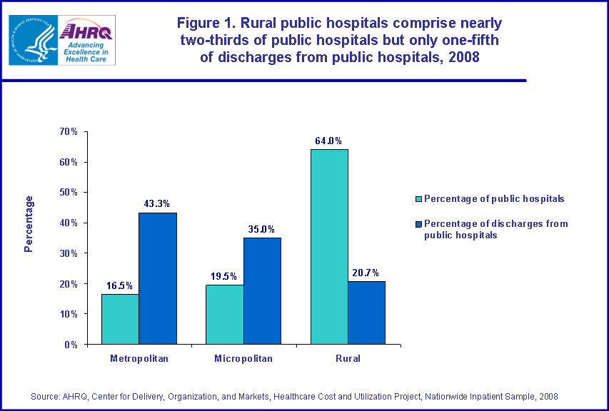 Figure 1. Rural public hospitals comprise nearly two-thirds of public hospitals but only one-fifth of discharges from public hospitals, 2008. Bar chart; In metropolitan areas, 16.5 percent of hospitals are public; 43.3 percent of discharges are from public hospitals. In micropolitan areas, 19.5 percent of hospitals are public; 35.0 percent of discharges are from public hospitals. In rural areas, 64.0 percent of hospitals are public; 20.7 percent of discharges are from public hospitals. Source: AHRQ, Center for Delivery, Organization, and Markets, Healthcare Cost and Utilization Project, Nationwide Inpatient Sample, 2008.