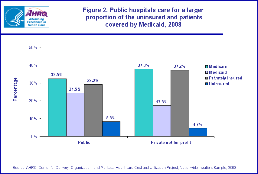 Figure 2. Public hospitals care for a larger proportion of the uninsured and patients covered by Medicaid, 2008. Bar chart; In public hospitals: 32.5% of coverage was Medicare, 24.5% of coverage was Medicaid, 29.2% of coverage was Privately insured, 8.3% of coverage was Uninsured. In private not-for-profit hospitals: 37.8% of coverage was Medicare, 17.3% of coverage was Medicaid, 37.2% of coverage was Privately insured, 4.7% of coverage was Uninsured. Source: AHRQ, Center for Delivery, Organization, and Markets, Healthcare Cost and Utilization Project, Nationwide Inpatient Sample, 2008.