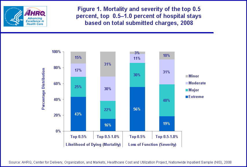 • Patients with the most expensive hospital stays were much more severely ill: 73 percent of patients in the top 5 percent of stays had major or extreme loss of function compared to only 23.9 percent of patients in bottom 95 percent of stays. Patients in the top 0.5 percent of stays were even more severely ill: 94.2 percent had major or extreme loss of function.