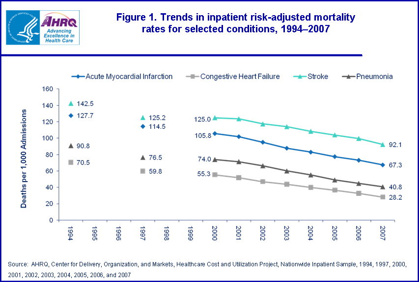 HCUP Statistical Brief #98. Figure 1. Trends in inpatient risk-adjusted mortality rates for selected conditions, 1994-2007. Trend line chart; deaths per 1,000 admissions; 1994, Congestive heart failure, 70.5; pneumonia, 90.8, acute myocardial infarction, 127.7; stroke, 142.5; 1997, Congestive heart failure, 70.5; pneumonia, 90.8, acute myocardial infarction, 127.7; stroke, 142.5; 2000, Congestive heart failure, 59.8; pneumonia, 76.5, acute myocardial infarction, 114.5; stroke, 125.2; 2001, Congestive heart failure, 55.3; pneumonia, 74.0, acute myocardial infarction, 105.8; stroke, 125.0; 2002, Congestive heart failure, 55.0; pneumonia, 70.8, acute myocardial infarction, 99.7; stroke, 124.5; 2003, Congestive heart failure, 50.5; pneumonia, 62.8, acute myocardial infarction, 96.7; stroke, 119.5; 2004, Congestive heart failure, 45.5; pneumonia, 60.8, acute myocardial infarction, 94.7; stroke, 117.5; 2005, Congestive heart failure, 35.5; pneumonia, 52.8, acute myocardial infarction, 82.7; stroke, 116.5; 2006, Congestive heart failure, 30.5; pneumonia, 45.8, acute myocardial infarction, 77.7; stroke, 110.5; 2007, Congestive heart failure, 28.2; pneumonia, 40.8, acute myocardial infarction, 67.3; stroke, 92.1. Source: AHRQ, Center for Delivery, Organization, and Markets, Healthcare Cost and Utilization Project, Nationwide Inpatient Sample, 1994, 1997, 2000, 2001, 2002, 2003, 2004, 2005, 2006, and 2007.