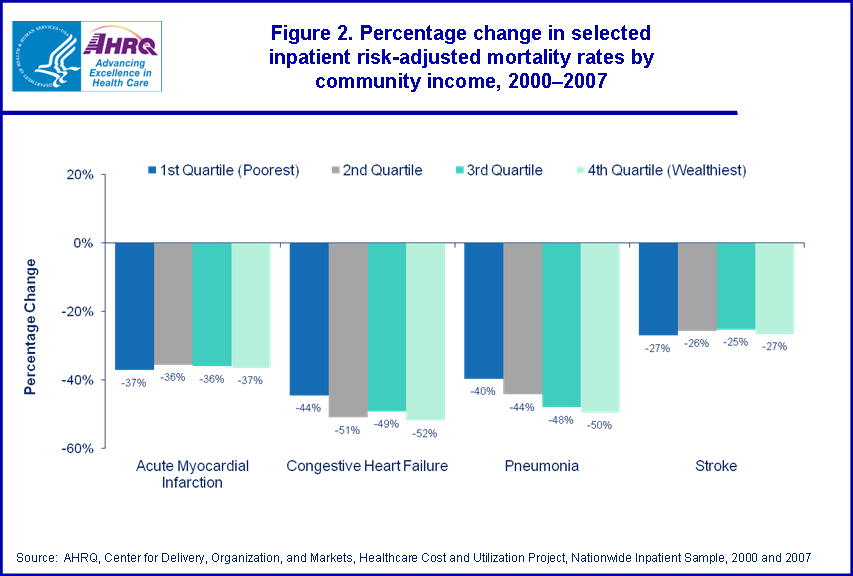 HCUP Statistical Brief #98. Figure 2. Percentage change in selected inpatient risk-adjusted mortality rates by community income, 2000-2007. Bar chart; percentage change; acute myocardial infarction in the first quartile (poorest), -37%; second quartile, -36%; third quartile, -36%; fourth quartile (wealthiest), -37%; percentage change; congestive heart failure in the first quartile (poorest), -44%; second quartile, -51%; third quartile, -49%; fourth quartile (wealthiest), -52%; percentage change; pneumonia in the first quartile (poorest), -40%; second quartile, -44%; third quartile, -48%; fourth quartile (wealthiest), -50%; percentage change; stroke in the first quartile (poorest), -27%; second quartile, -26%; third quartile, -25%; fourth quartile (wealthiest), -27%. Source: AHRQ, Center for Delivery, Organization, and Markets, Healthcare Cost and Utilization Project, Nationwide Inpatient Sample, 2000 and 2007.