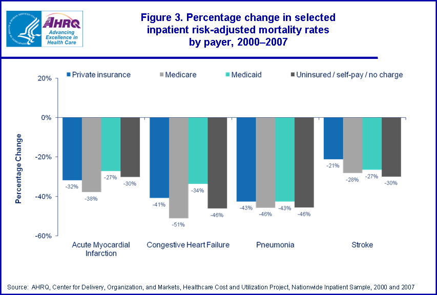 HCUP Statistical Brief #98. Figure 3. Percentage change in selected inpatient risk-adjusted mortality rates by payer, 2000-2007. Bar chart; percentage change; acute myocardial infarction with private insurance, -32%; Medicare, -38%; Medicaid, -27%; Uninsured/self-pay/no charge, -30%; percentage change; congestive heart failure with private insurance, -41%; Medicare, -51%; Medicaid, -34%; Uninsured/self-pay/no charge, -46%; percentage change; pneumonia with private insurance, -43%; Medicare, -46%; Medicaid, -43%; Uninsured/self-pay/no charge, -46%; percentage change; stroke with private insurance, -21%; Medicare, -28%; Medicaid, -27%; Uninsured/self-pay/no charge, -30%. Source: AHRQ, Center for Delivery, Organization, and Markets, Healthcare Cost and Utilization Project, Nationwide Inpatient Sample, 2000 and 2007.
